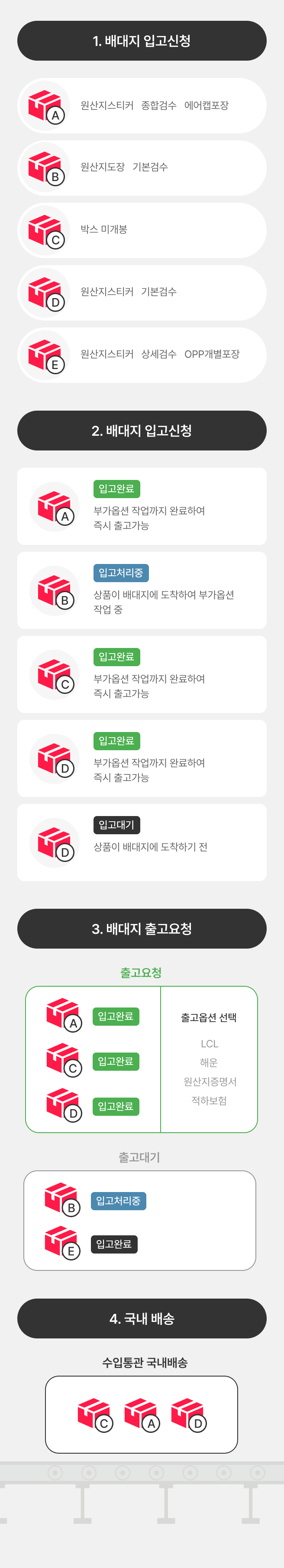 일반 배송대행 서비스(배대지)는 배송대행 신청서에 포함된 모든 품목이 배대지에 입고완료되어야 출고할 수 있는 반면,
