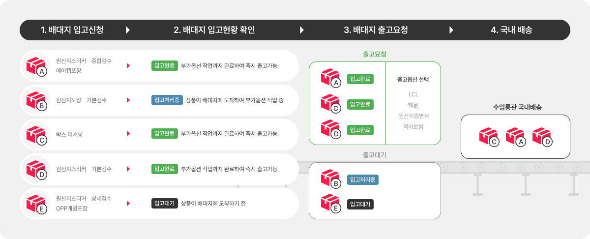 중국 현지에서 출고된 상품을 검수 → 보관 → 합배송(부분배송) → 국제운송 → 수입통관 → 국내 배송까지