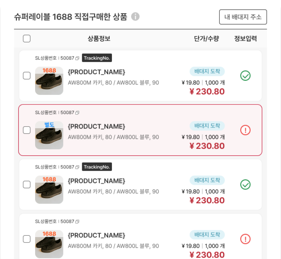 '1688 직접구매' 기능을 통해 사입한 상품의 현지 배송상태, 이미지,