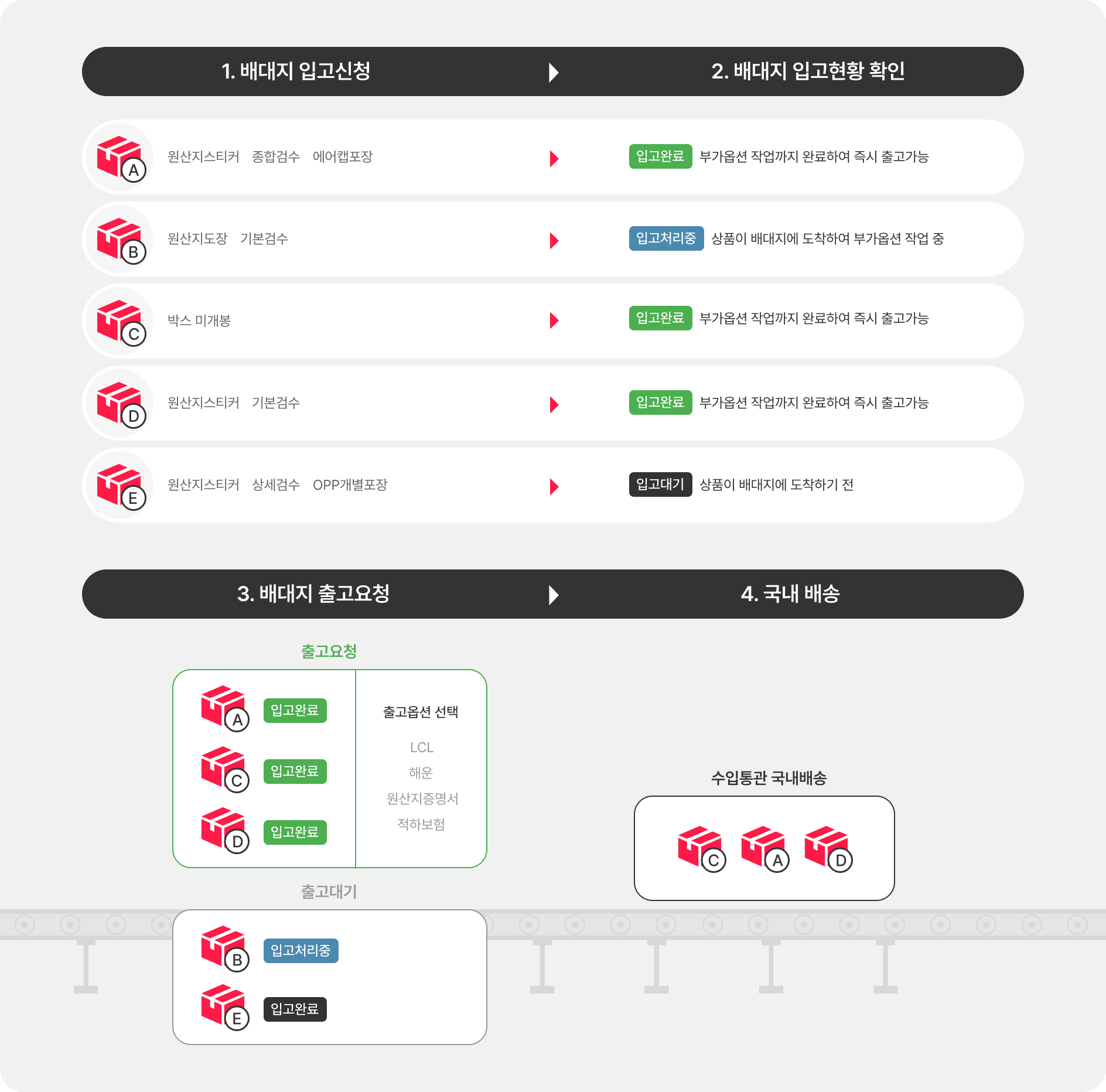 중국 현지에서 출고된 상품을 검수 → 보관 → 합배송(부분배송) → 국제운송 → 수입통관 → 국내 배송까지
