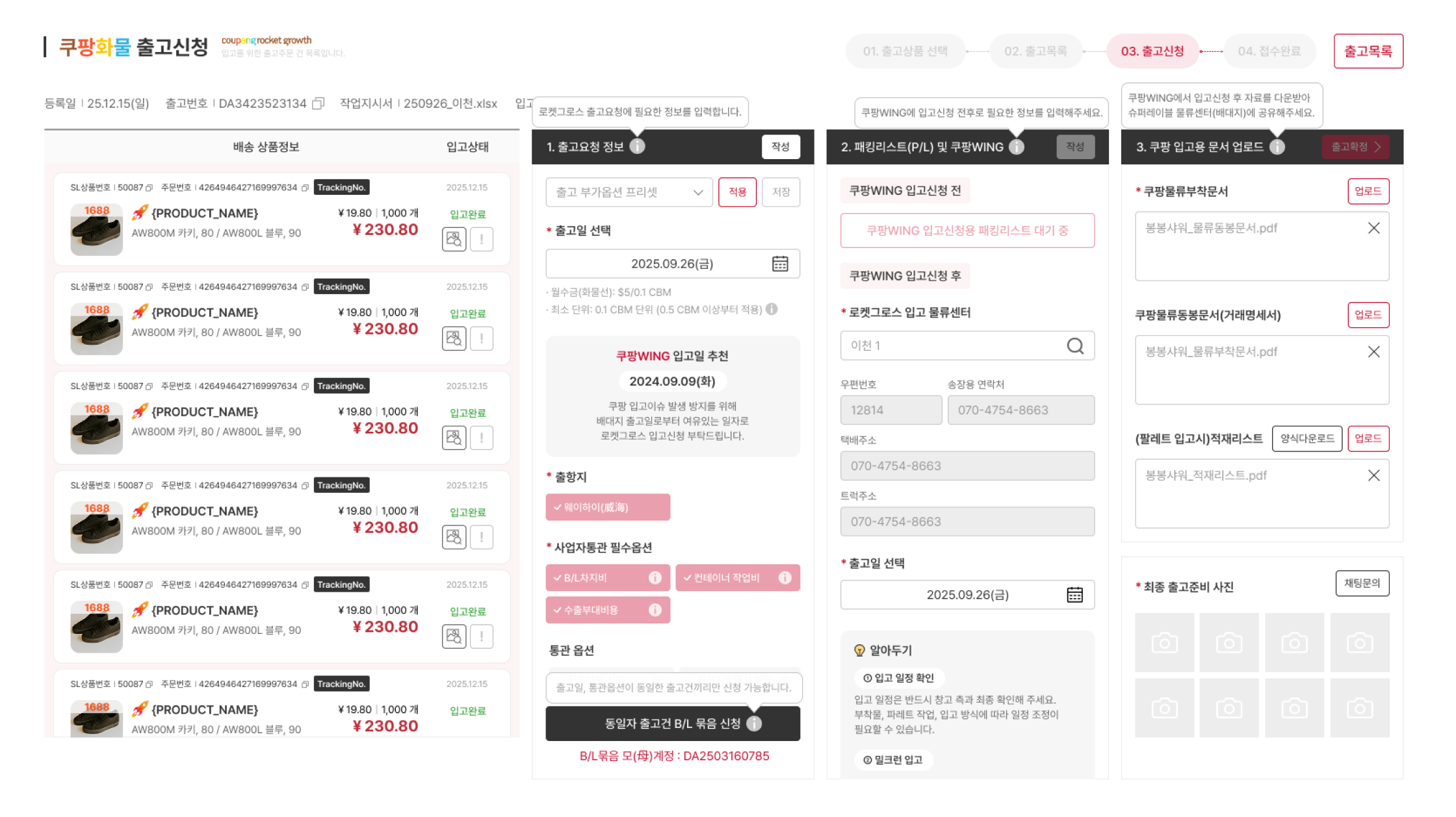 로켓그로스 입고프로세스를 단계별로 구분하여 필요한 정보값을 입력하여,