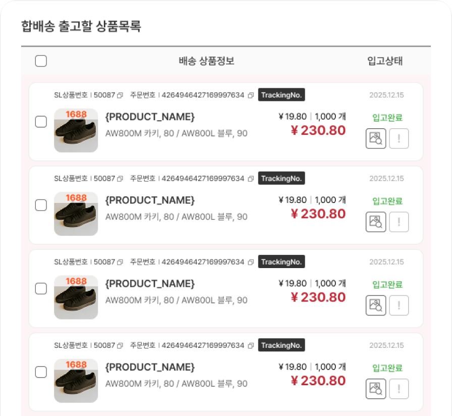 여러 1688 판매자 또는 제조사에게서 출고된 상품을 중국 현지 창고에서 입고 후 합배송하여 국제운송 비용을 절감할 수 있습니다. 다품목(SKU) 사입 구조에 최적화된 방식입니다.