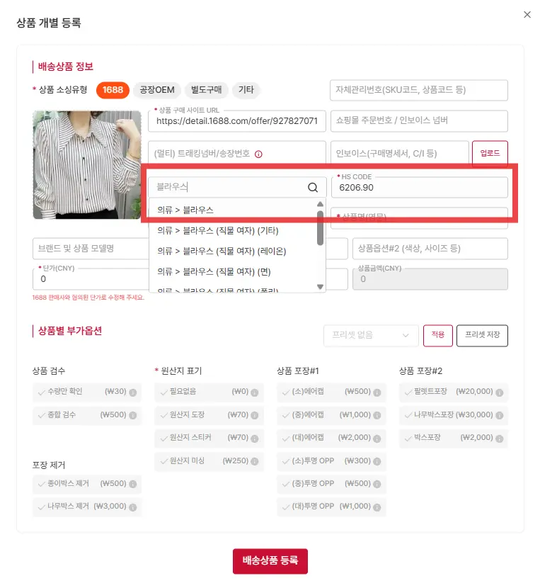 플랫폼 내 배송·물류 메뉴에서 상품 상세정보 등록 시 품목을 선택하면 HS CODE를 확인할 수 있습니다. 복잡한 코드 검색 없이 간편하게 조회 가능합니다.(슈퍼레이블 상품 상세정보에서 HS Code 확인)