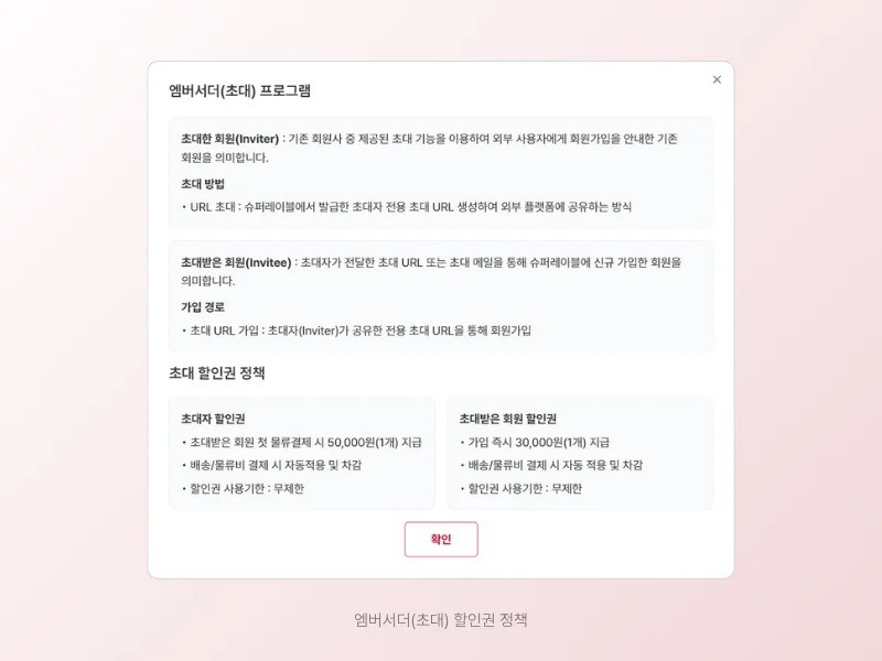 할인권 지급시점 : 초대자의 초대URL을 통해 슈퍼레이블 회원가입 완료 즉시 3만원 할인권 1개 발급